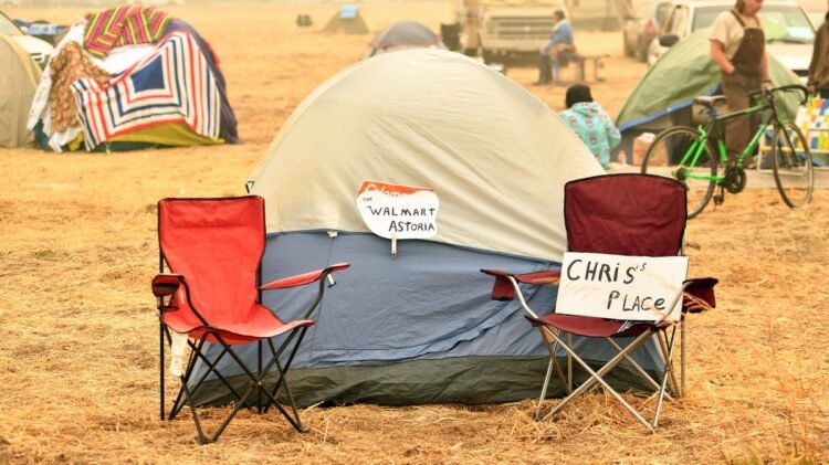 A makeshift address is seen on a tent at an evacuee encampment in a Walmart parking lot in Chico, California on November 15, 2018. Image via Getty.
