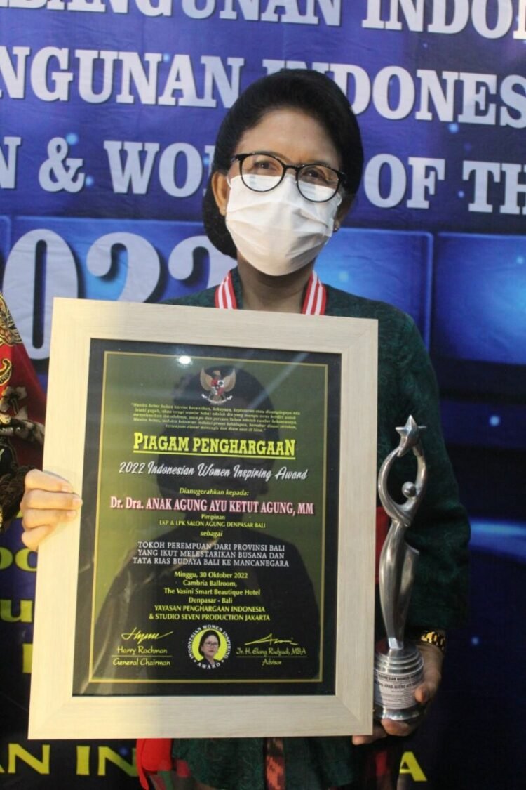 Denpasar – Founder atau pendiri Lembaga Kursus dan Pelatihan Salon Agung Dr. Dra. AA Ayu Ketut Agung, M.M. menerima penghargaan (award) kategori “Indonesian Women Inspiring Award” sebagai “Tokoh Perempuan dari Provinsi Bali yang telah turut Melestarikan Busana, Tata Rias, dan Budaya Bali ke Mancanegara”.