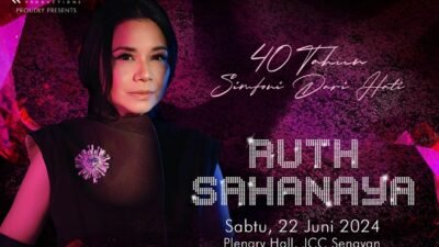 Jakarta – Diva Indonesia Ruth Sahanaya merayakan 40 tahun kariernya dengan konser megah berjudul ’40 Tahun Simfoni Dari Hati’ di Plenary Hall, Jakarta Convention Center (JCC), Sabtu malam (22/6). Dalam konser yang dipersiapkan matang oleh Renjana Productions dengan music director Tohpati, Ruth Sahanaya memukau penonton dengan penampilannya yang elegan dan 30 lagu hits dari berbagai era.