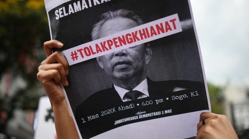A protester holds a sign that reads “Reject traitors” across an image of Prime Minister Muhyiddin Yassin in Kuala Lumpur. Photo: Mohd Rasfan / AFP