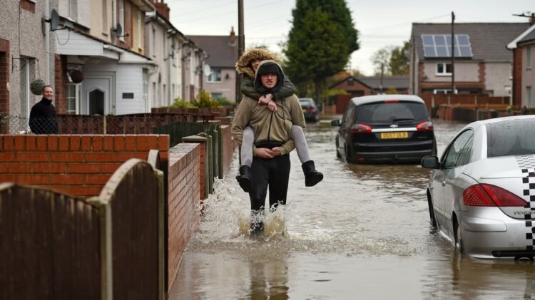 People wade through floodwater as they pass houses on a flooded street in Doncaster, following flash flooding in 2019. Photo: OLI SCARFF / AFP via Getty Images