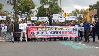 Beritaenam.com, Klaten – Sejumlah warga di Klaten lakukan unjuk rasa di depan Gedung DPRD Kabupaten Klaten Senin siang (17/3/25). Mereka menuntut salah satu anggota Dewan bernama Triyono agar dicopot dari jabatannya.