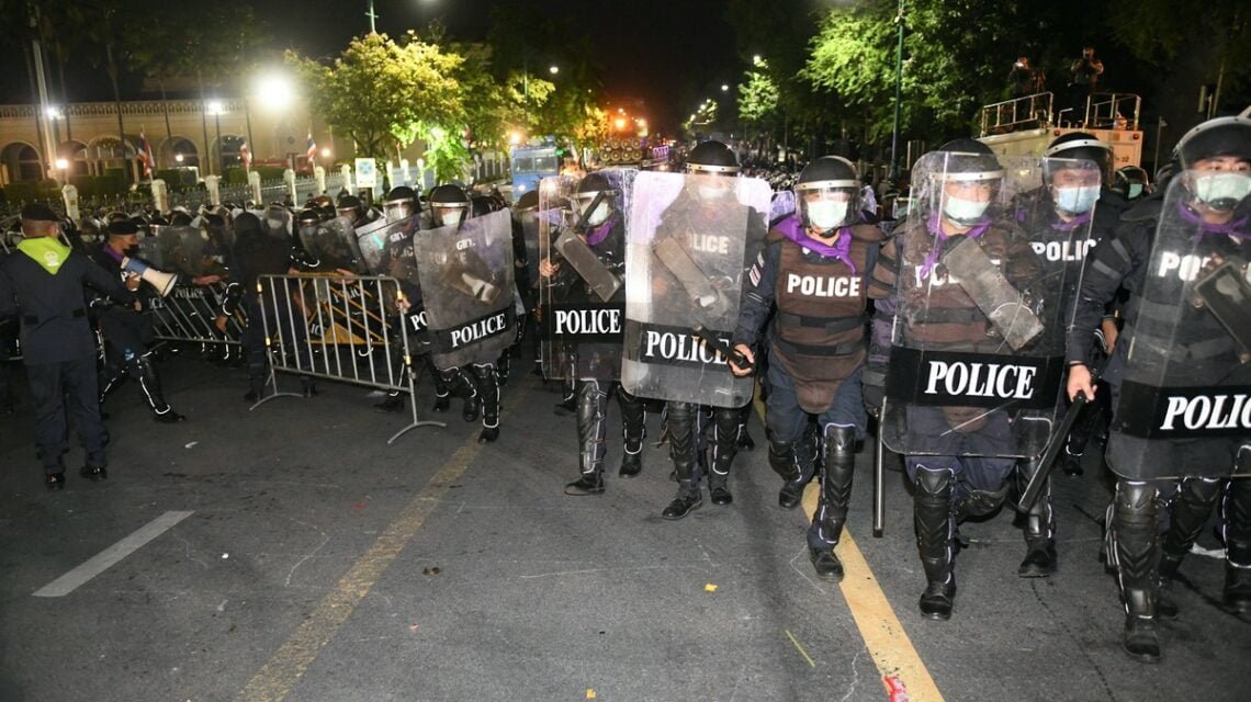 Polisi anti huru hara secara paksa membersihkan pengunjuk rasa yang berkemah semalam di luar rumah pemerintah Bangkok tak lama setelah dekrit darurat berlaku pada pukul 4 Kamis pagi. Beberapa pemimpin protes terkemuka juga ditangkap, kata Pengacara Hak Asasi Manusia Thailand.