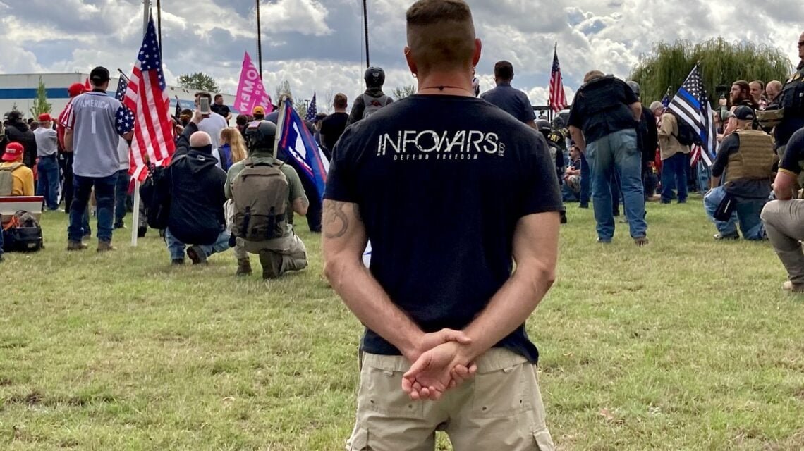 At a Proud Boy rally in Portland in August, a far-right activist fired into a group of Black Lives Matter protesters. Proud Boy supporter Alan Swinney also pulled a gun on protesters during that same event. Swinney was a no-show at Saturday’s event however. He wrote on Parler, a popular right-wing alternative to Twitter, that there was a warrant out for his arrest. He said he didn’t know what the charges were but was “sure it had something to do with shooting violent protesters with paintballs.” American Wolf is also crowdfunding for Swinney’s legal defense, and has raised $1,400 so far.