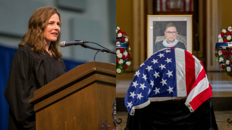 Left: AMY CONEY BARRETT, UNITED STATES COURT OF APPEALS FOR THE SEVENTH CIRCUIT JUDGE (ROBERT FRANKLIN /SOUTH BEND TRIBUNE VIA AP, FILE) Right: Justice Ruth Bader Ginsburg lies in state in Statuary Hall of the U.S. Capitol in Washington on Friday, Sept. 25, 2020. (Shawn Thew/Pool via AP)
